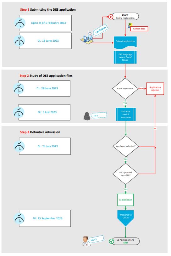Pursuant to Art. 32 of the University Law, access to studies leading to a DES degree is open to applicants who meet the requirements of Article 1, paragraph 1, letters a), b), d) and e) of the amended law of 29 April 1983 on practising the professions of physician, dental physician and veterinary physician. For more information, please also see Section 10 of the 2020 Law on Specialisation.